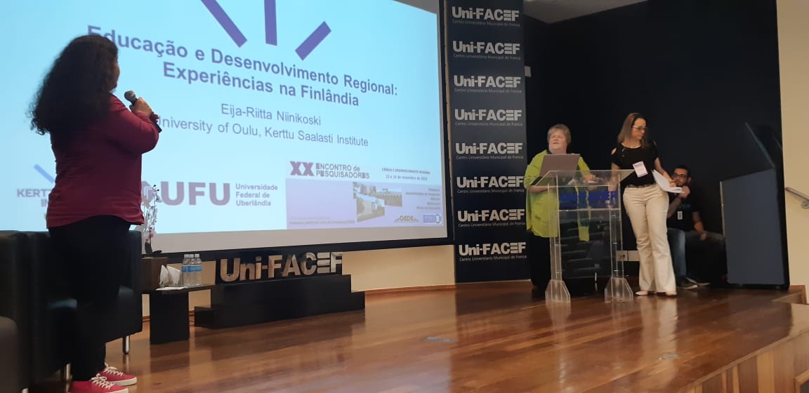 A Professora Eija-Riitta Niinikoski foi convidada pelo Prof. Dr. Silvio Carvalho Neto, que, ao lado da Profa. Dra. Marinês Santana Justo Smith, organiza o XX ENCONTRO DE PESQUISADORES Uni-FACEF, para que a pesquisadora finlandesa trouxesse questões de desenvolvimento e empreendedorismo presentes na relação entre o Brasil e a Finlândia.